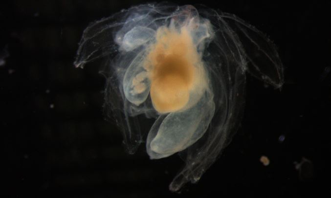 This is a small, oval-shaped pneumatophore with a pigmented apex. Approximately one-third of its total length constitutes the nectostome, which carries 15 to 20 pairs of mature nectophores arranged alternately in biserial fashion, along with several immature buds. The nectophore isn’t flattened from top to bottom; instead, it features dorso-lateral and ventro-lateral ridges that connect through a lateral vertical ridge. Near the ostium, the dorso-lateral ridge splits into two branches. When viewed from above, the nectosome appears triangular and muscular. The dorsal and ventral radial canals are short and straight, while the lateral radial canals are longer and curved, forming a semicircle on the sides of the nectosac before joining the circular canal.